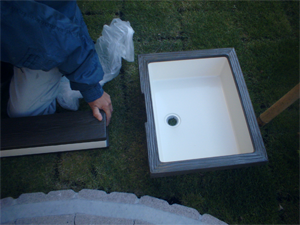 配管接続をし、モルタル固定で水栓柱、ガーデンパンを固定して柴を元どおり植え直し、試運転して完成です。