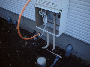 右は工事中の写真ですが最近の給湯器は給湯効率もよく、またとてもコンパクトになって据え置きタイプより壁掛けタイプが良く売れています。