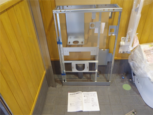 次の写真は同トイレ内のオストメイトという見慣れない器具の設置途中のフレームだけの写真です。